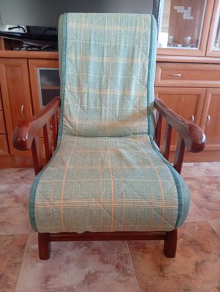 Acogedor sillón balancín con un diseño clásico. - Tapicería a cuadros en tonos verdes y ocres. - Brazos de madera pulida. - Base balancín para mayor comodidad.