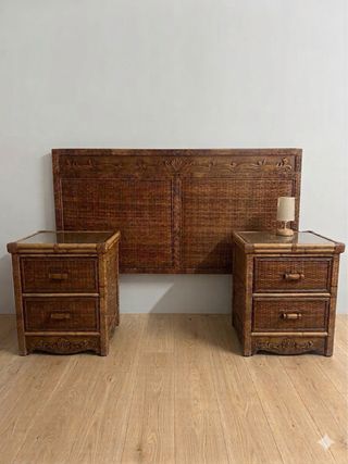 Conjunto de muebles de ratán para habitación, ideal para crear un ambiente cálido y natural. - Cabecero de gran tamaño con detalles tallados. - Dos mesitas de noche con dos cajones cada una y tapa de cristal. - Estructura de ratán y madera. Cabecero de 159 cm de ancho x 122 cm de alto x 4 cm de profundidad Mesitas de 51 cm de ancho x 46 de fondo x 65 de alto