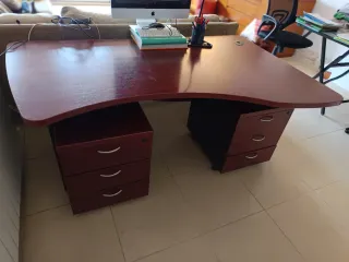 Mesa de escritorio espaciosa y práctica, ideal para tu hogar u oficina. Se encuentra en perfecto estado, como nueva. - Medidas: 155 cm de largo x 1 x 70 cm de alto. - Diseño curvo que optimiza el espacio. - Incluye 2 cajoners lateral con tres cajones.