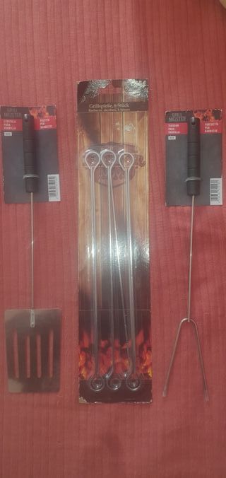 1 tenedor para parrilla de acero inoxidable. 34 cms aproximadamente. 1 espatula para parrilla. 34 cms aproximadamente. Acero inoxidable. 6 pinchos para barbacoa.