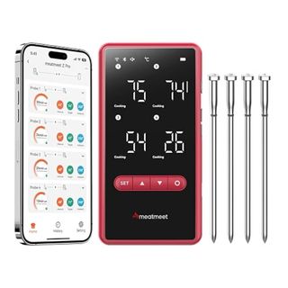 Termómetro inalámbrico para carne totalmente nuevo, ideal para barbacoa, horno, parrilla, ahumador y cocina diaria. Incluye base con pantalla LED, botones y alarma, por lo que también se puede usar sin app. Lleva 4 sondas ultrafinas con 6 sensores cada una para controlar varias piezas a la vez con lectura rápida y precisa. Resiste hasta 595 °C, sondas de acero inoxidable e impermeabilidad IP69. Muy útil para controlar el punto sin abrir horno o tapa constantemente. Entrega en mano en Madrid y envíos solo por Wallapop. #TermometroCarne #Barbacoa #WiFi #Bluetooth #Nuevo Marca Meatmeet