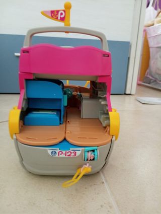 Autocaravana de juguete de Barbie en color rosa. Contiene DreamCamper 3 en 1 de Barbie, 1 camioneta extraíble, 1 barca, piscina, utensilios de comida, sartén, leche, zumo de naranja, botellas de agua, comida para barbacoa, cepillos de dientes, pastas de dientes, mantas, saco de dormir, cañas de pescar, taburetes, hoguera transformable y mesa de pícnic. Incluye una sala de estar, un patio con piscina, un cuarto de baño con ducha desplegable, un dormitorio en el techo y una cocina. Con su caja original. Precio original 135€.
