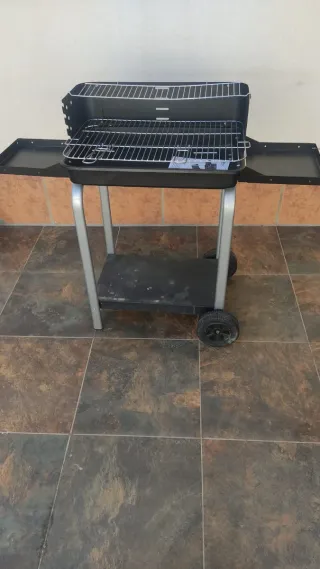 Barbacoa de carbón con ruedas, ideal para tus reuniones al aire libre. - Estructura principal de metal. - Superficies laterales de madera. - Estante inferior de madera. - Ruedas para fácil transporte. Solo se ha usado dos veces