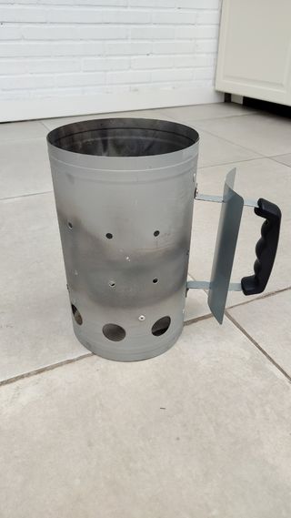 Se vende encendedor de carbón para barbacoa. Está en buen estado, aunque presenta algunas marcas de uso. - Ideal para encender carbón de forma rápida y eficiente. - Fabricado en metal resistente. - De regalo una bolsa de pastillas de encendido ecológicas OK Fuego.