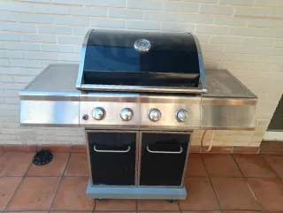 Barbacoa de gas con cinco quemadores principales y un quemador lateral. - Encendido electrónico. - Bandeja recogegrasas. - Ruedas para fácil transporte. Funciona a la perfección, no es nueva pero está bien