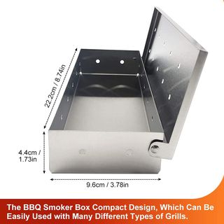 Le da a la comida sabor ahumado y convierte tu barbacoa en deliciosos filetes, costillas, chuletas de pollo y cerdo, que prometen grandes resultados y fantásticos sabores Independientemente de si utilizas un carbón, gas o una parrilla de caldera, coloca el ahumador de alto rendimiento Con tapa abatible garantiza que no puedas detener el humo simplemente agregando más chips de madera está hecha de acero inoxidable más grueso, dura más, reduce la deformación. Sin agujeros en la parte inferior para evitar que los chips se quemen. No se preocupe de que las virutas de madera se quemen demasiado rápido 22,2 x 9,6 x 4,4 cm