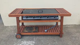 Barbacoa de gas con estructura de madera y superficie de cocción. - Encimera de madera con bordes. - Quemadores de gas. - Ruedas para facilitar el transporte. - Estante inferior de madera.