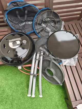 Barbacoa de gas Cadac Carri Chef 2, ideal para llevar de camping o de viaje. Incluye varios accesorios para diferentes tipos de cocción. - Bolsa de transporte Carri Chef. - Rejilla BBQ Grid de Cadac. - Parrilla redonda y skottel lisa - patas de aluminio que se fijan con rosca - Base de quemador Skottel. - Manguera de gas. Tapa permite brasear y cocer puesdispone de termómetro con control de temperatura, hornear, ahumar o cocer a su gusto No tiene ralladas, golpes o deterioro como se puede ver en las imágenes. Siempre protegida y limpiada una vez utilizada. Se puede transportar con bolsa incluida en perfecto estado.
