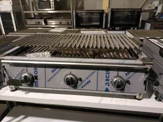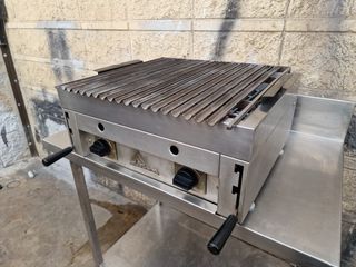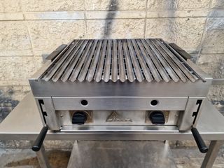 Barbacoa de roca lavica brasa de segunda mano como nueva de tres fuegos. Con 2 quemadores independientes que pueden ir a butano propano o natural, una potencia de 12 KWy parrilla acanalada. Comprar un asador de piedra volcanica permite trabajar igual que una plancha con la ventaja de aportar el sabor de carbon a la carne pescado etc. Mide 60 de largo por 62 de fondo y 28 de alto. Tenemos gran variedad en maquinaria de hostelería de ocasion, equipamiento revisado y con garantía, monta tu bar restaurante con menos dinero. Ven a nuestra nave o llamanos al 6/4/0/7/6/2/6/4/7