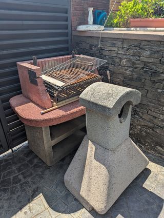 Preciosa barbacoa de exterior, ideal para tus reuniones. Está en buen estado, aunque muestra señales normales de uso. - Perfecta para barbacoas al aire libre. - Estructura de piedra resistente y duradera. - Parrilla de metal incluida. Peso 100 Kg.