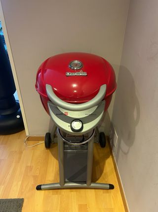Barbacoa Char-Broil en color rojo y plateado. Perfecta para disfrutar de tus comidas al aire libre. - Diseño moderno y funcional. - Ruedas para fácil transporte.