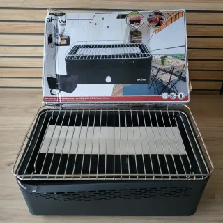 Barbacoa portátil diseñada para ser compacta y fácil de transportar. Usada 4 veces contadas. - Incluye parrilla y cubeta para carbón. - Estructura metálica resistente. -Solo funciona el modo ventilador con pilas.