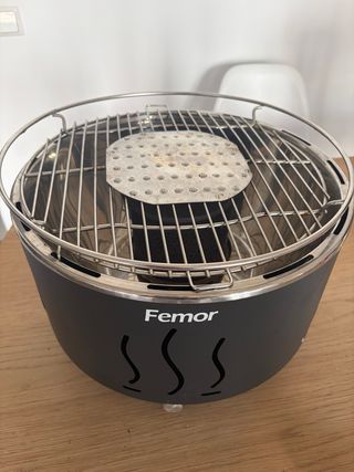 Barbacoa Femor sin humos, ideal para disfrutar de tus comidas al aire libre sin generar humo. - Sin estrenar. Nuevo. - Diseño portátil y compacto. - Incluye rejilla y funda de tela Femor. - Manual de usuario.