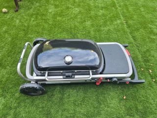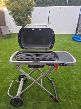 Oportunidad: Como nueva, 3 usos. Excelente Barbacoa Weber Traveler de gas. Una referencia en el mercado de las barbacoas. Es compacta y fácil de transportar gracias a sus ruedas y diseño plegable. Incluye funda oficial (coste €50). - Parrilla de gas portátil. - Ideal para camping o balcones pequeños. - Diseño plegable para fácil almacenamiento.
