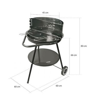 Marca Habitex Función especial Ruedas Tipo de combustible Carbón Dimensiones del producto: largo x ancho x alto 50 x 50 x 50 centímetros Requiere montaje Sí Material Acero aleado Barbacoa carbón supergrill 45. Cubeta acero lacado. Parrilla cromada altura regulable. Bandeja inferior de 46 cm de diámetro. Ruedas transporte.
