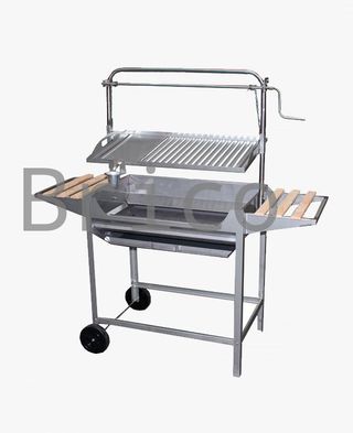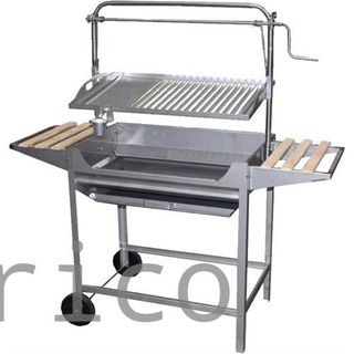 Barbacoa con parrilla argentina modelo Santa María. Posibilidad de usar con leña o carbón. Parrilla en acero inox. en forma de V regulable en altura mediante poleas dirigida con un volante de aluminio. Incorpora un freno de seguridad de poleas. Recoge-grasas extraíble. Cuba recubierta por ladrillos refractarios. Ruedas de goma, dos de ellas giratorias que incorporan freno. Dimensiones parrilla 72'5x41cm Peso 50Kg Dimensiones totales 147 alto x 45 fondo x 78.5 ancho + bandeja abatible. Cajón cenicero extraíble. Rejilla extraíble.