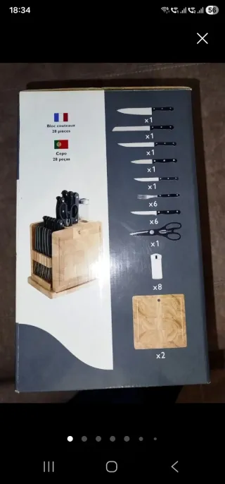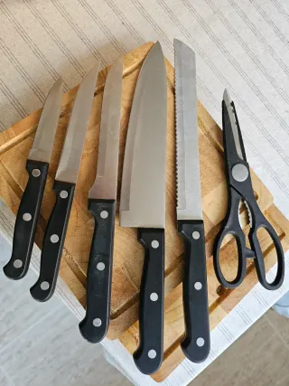 🔪Juego de cocina, tacoma de madera con base giratoria. Tacoma de 28 piezas 🍴🔪 ‣ Estado: usadas algunas piezas. Otras sin uso. ▪︎ Apto lavavajillas excepto tacoma o tablas de cortar. INCLUYE: 📦 • 1 tacoma con base qiratoria • 5 cuchillos de acero inoxidable • 6 cuchillos chuleteros de acerc inox. • 6 tenedores chuleteros de acero inox. • 8 botes especieros • 1tijeras. • 2 tablas. SIN LA CAJA ORIGINAL ( menaje utensilios cocinar despensa asar asado carne barbacoa soporte bloque coniunto accesorios ordenar corte cubertería pan trinchar pelar pelador grande pequeño larga sierra mango arcos cocinero vajilla especias ).