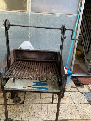 Barbacoa de hierro con un diseño robusto y práctico. Ideal para disfrutar de tus parrilladas al aire libre. - Estructura principal de metal. - Ruedas para facilitar su movilidad. - Mecanismo de cadena para ajustar la altura de la parrilla.