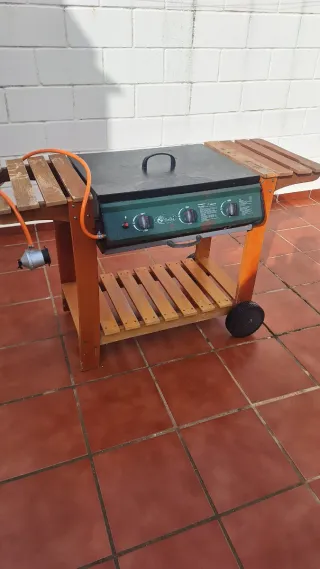 Barbacoa de gas butano con accesorios incluidos. Tiene muy poco uso. Dispone de: 4 fuegos 3 parrillas + 1 plancha Incluye bombona de butano + conexión de gas