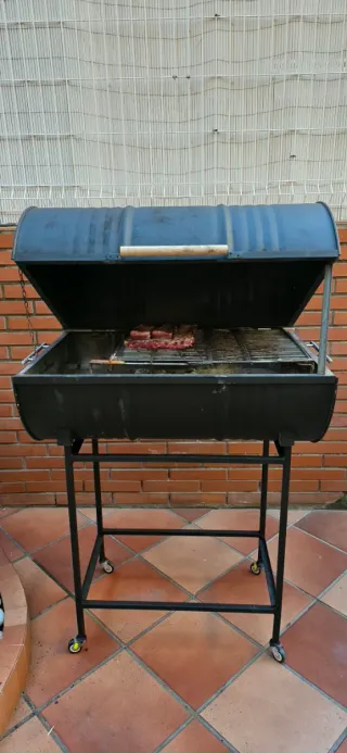 Barbacoa portátil con un diseño robusto y funcional. Perfecta para disfrutar de tus comidas al aire libre. - Estructura principal de metal. - Donde se coloca las brasas de hierro 2.5 mm - Asa de madera para facilitar su manejo. - Contorno soldado de angulo robusto - Separado de su base para poder transportar. - La estructura metálica de la base tiene ruedas para poder mover cln facilidad - Hecha por un profesional - Limpia para poder meter en el maletero - Solo utilizada 1 vez para verificar todo.