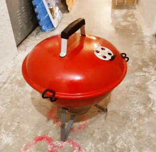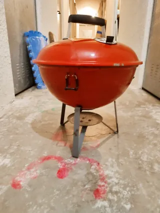 Barbacoa portátil de color rojo. Con tapa y agujeros para el humo y ventilación debajo para la brasa. Diametro de la rejilla 36cm