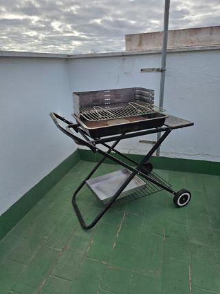 Barbacoa de gas en buen estado, ideal para barbacoas en balcones o terrazas pequeñas. Solamente usada una vez. Va perfecta. - Dispone de dos quemadores. - Estructura y tapa de metal. - Incluye ruedas para facilitar su transporte.