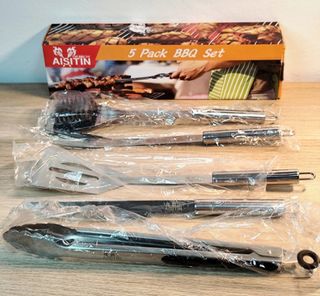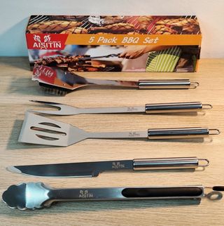 Todos los utensilios están hechos de acero inoxidable , de muy buena calidad y son muy duraderos. Con mangos resistentes al calor e islantes ,incluyen: - 1 espátula. - 1 pinza para barbacoa. - 1 tenedor largo para trinchar. - 1 cepillo de limpieza. - 1 cuchillo .