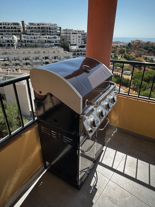 Barbacoa de exterior en perfecto estado, lista para usar. - Dos espacios(Plantas) para cocinar. - Cuatro quemadores. - Tapa de color marrón oscuro. - Estructura de acero inoxidable.