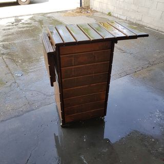 mesa auxiliar para barbacoa realizada en madera maciza de Iroko ampliable 2 alas laterales, ruedas en la base e interior en 2 partes, una de ellas aislada termicamente para conservar bebidas frías . para dejarlo nuevo solo lo tienes que lijar un poco y darle aceite de teka el grosor de cada tabla es de 24mm y esta realizado a mano con Iroko. Como mesa auxiliar para barbacoas es perfecta. Las medidas con las 2 alas desplegadas es de 120cmx45