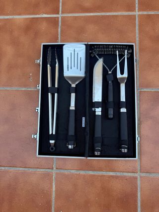 ✅ Juego de utensilios para barbacoa en maletín de aluminio. ¡Perfecto para tus asados! ✅ Incluye 1 juego completo de herramientas. ✅ Utensilios con mangos de madera resistentes. ✅ Maletín metálico para un fácil transporte y almacenamiento.