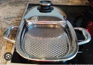 Barbacoa/parrilla Arondo AMC de 32cm. Incluye regalos AMC A estrenar!! Tu barbacoa para dentro de casa, donde podrás hacer tus ricos chuletones, pancetas, cortillares, chorizos, pescados, brochetas, verduras, hamburguesas, tostadas...con efecto barbacoa sin ahumarte ni mancharte ni pasar calor, todo queda delicioso gracias a sus pirámides que desgrasen los alimentos como lo harían las brasas de una bbq...una pasada, además es el tamaño grande para hacer muchos alimentos a la vez. Espectacular pieza fabricada en acero premium grado quirúrgico sin ningún tóxico ni material dañino para la salud Más del 48% dto. 1060€ a 550€!!!