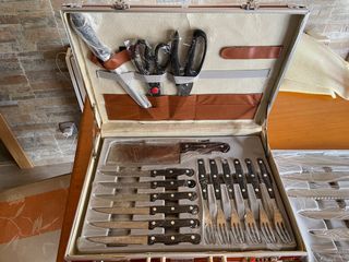 Maletín de 25 piezas, sin estrenar, incluye cuchillos, tenedores, dos tijeras y una chaira. Maletín con cierre de seguridad, ideal para transportar con comodidad.