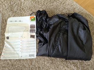 Cubierta para barbacoa de la marca NATERIAL, en color negro. Está prácticamente nueva. - Medidas: 133 x 68 x 88 cm. - Material: poliéster. - Incluye funda de almacenamiento.