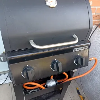 Barbacoa de gas con acabado en negro y detalles plateados. Ideal para disfrutar de comidas al aire libre. - Tres quemadores. - Encendido electrónico. - Termómetro integrado en la tapa. - Manguera y regulador incluidos -dos mesas abatibles que se puedes quitar dos ruedas laterales para mover con su funda para guardar bombona incluida.