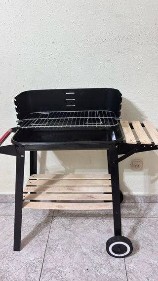 Barbacoa con un diseño práctico y funcional, ideal para disfrutar de tus parrilladas al aire libre. Cuenta con una parrilla de metal y estantes laterales y inferiores para mayor comodidad. - Estructura principal en metal negro. - Estantes de madera. - Asa lateral para facilitar el transporte.