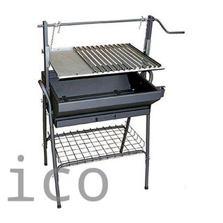 Barbacoa Brava Parrilla 80x50x115 cm - Orework Barbacoa de carbón y leña, modelo Brava, con parrilla de acero inoxidable. Recomendada para 10 comensales. Diseño simple, fabricada en hierro forjado, pintura resistente al fuego. Parte plana para la plancha y parte de parrilla con drenaje de líquidos que se pueden recoger en un recipiente. Barbacoa con elevador reversible de manivela para la parrilla. Barbacoa con función grill que aporta un extra a la hora de gratinar alimentos, elevador de parrilla y recogedor de grasas integrado. Su diseño sobre pie permite cocinar con mayor comodidad. Incluye, además, estante de rejilla infe...