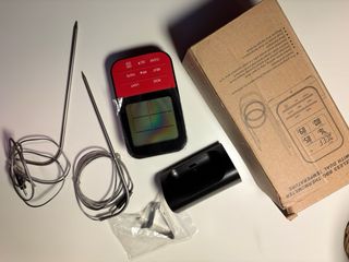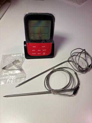 Termómetro digital inalámbrico para cocina y barbacoa. Incluye dos sondas para medir temperaturas. - Pantalla digital. - Botones de control. - Sondas de metal. - Cable de conexión.