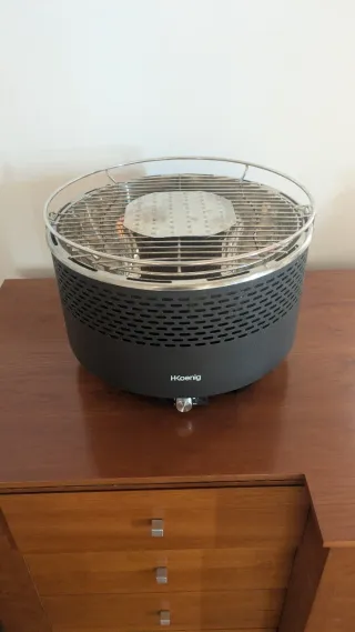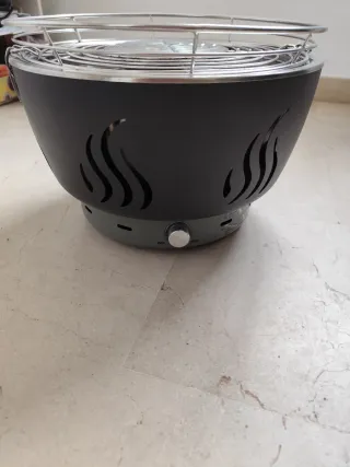 Barbacoa portátil de carbón con un diseño moderno y funcional. - Ventilador integrado para un control rápido del calor. - Rejilla de cocción de acero inoxidable. - Cuerpo resistente y duradero.