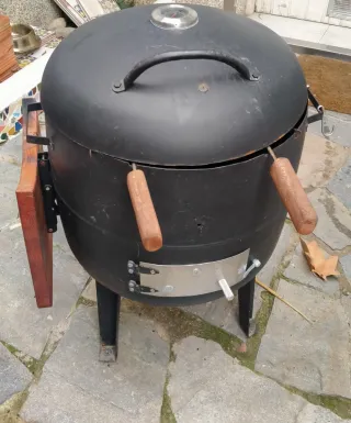 Barbacoa de estilo ahumador con acabado en negro y detalles metálicos plateados. Cuenta con 2 asas para facilitar su manejo. - Diseño cilíndrico. - Termómetro integrado en la tapa. - Puerta de acceso frontal.