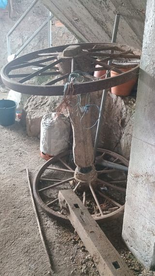 Conjunto de ruedas de carro antiguas, perfectas para decoración o proyectos de restauración. - Estructura robusta de metal. - Diseño clásico de carro.