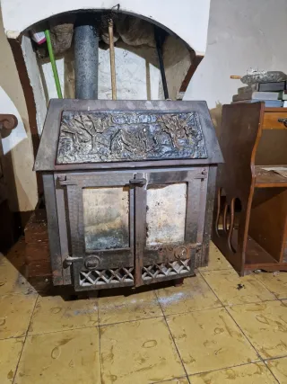 Estufa de leña antigua con detalles decorativos en la parte superior. Ideal para espacios rústicos. - Fabricada en hierro fundido. - Puertas frontales con cristal (actualmente sin ellos) - Diseño ornamentado en la tapa superior. - Incluye una base con rejilla para la entrada de aire o limpieza. - La salida de humos es superior. No se ha probado recientemente, se vende tal cual. Ideal para restaurar, casa rural, taller o como estufa auxiliar. Recogida en mano por su peso. 67 x 33 x 81