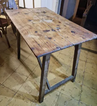 Mesa tocinera auténtica antigua de madera maciza. Su diseño robusto y su acabado natural le dan un carácter único. - Tablero de madera maciza con juntas. - Patas de madera maciza con travesaño. - Estilo rústico y antiguo. - Muy usada: marcas, manchas, desgaste. Ideal para restaurar, cocina rústica, bodega, casa de campo o mesa auxiliar. 96 x 60 x 80