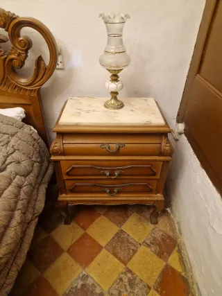 Conjunto de muebles de dormitorio de estilo clásico, fabricados en madera. - Cabecero de cama con diseño ornamentado. - Mesitas de noche a juego con cajones, con tablero de mármol. - Cómoda de dormitorio de madera con tablero de mármol y espejo a juego. - Armario de madera. - Acabado en madera natural.