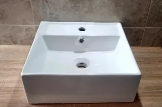 Lavabo moderno de diseño cuadrado para sobre encimera. Color: Blanco mate Material: Cerámica Dimensiones totales: 410 x 410 x 150 mm (ancho x profundo x alto) Diámetro del orificio de drenaje: 4,5 cm Diámetro del orificio de grifo: 3,5 cm Con un rebosadero y orificio para el grifo Presenta una superficie mate y un diseño de lujo. Tipo de instalación: Sobre la encimera o montado en la pared Fabricado en arcilla cocida, la cerámica es duradera y resistente a golpes y rayones. Impermeable, fácil de mantener y limpiar.
