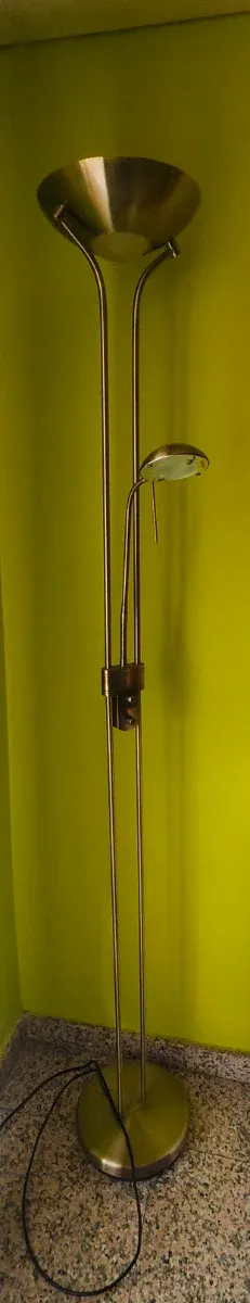 Elegante lámpara de pie con un diseño moderno y funcional. - Estructura principal en metal. - Pantalla superior con acabado metálico. - Lámpara auxiliar con brazo flexible. (Bombilla fundida)