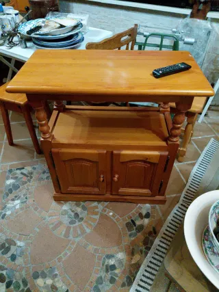 Mesa auxiliar de pino con un diseño práctico y funcional. - Cuenta con un armario inferior con dos puertas. - Dispone de un estante intermedio. - Patas torneadas que le dan un toque clásico.