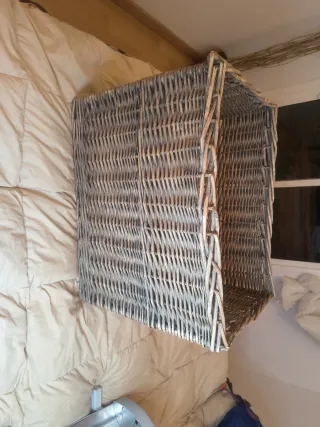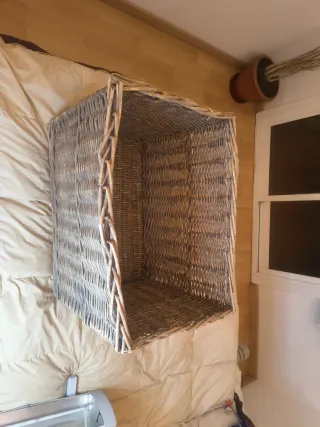 Caja de almacenaje de gran tamaño, tejida con mimbre. - Diseño rectangular. - Tonos beige y grises. Medidas en las fotos. Muy grande y bonita. Ideal para guardar desde juguetes a ropa. Está en excelente estado. La vendo por 5 euros, costó 25 euros. No es negociable. Saludos