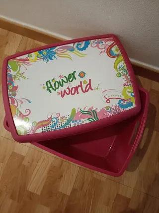 Práctica caja de almacenaje con un divertido diseño infantil. - Ilustraciones de animales como leones y jirafas. - Tapa con motivos coloridos y texto Flower World. - Ribete superior en color fucsia. 2 cajas 16€. 1 caja 10€