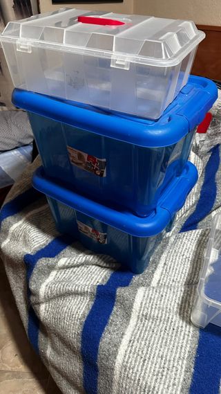 Conjunto de cajas de plástico para organizar tus pertenencias. Son apilables y cuentan con tapas transparentes. - Color azul con tapa transparente. - Material resistente.