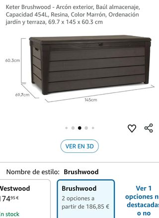 Faltan los amortiguadores y el libro con las instrucciones.! Keter Brushwood - Arcón exterior, Baúl almacenaje, Capacidad 454L, Resina, Color Marrón, Ordenación jardín y terraza, 69.7 x 145 x 60.3 cm Marca Keter Color Marrón Material Polipropileno Inyectado / Madera Función especial Apilable Estilo Brushwood